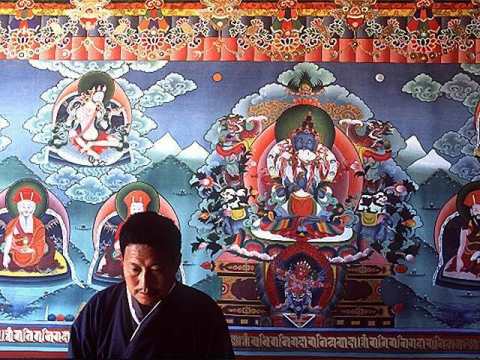 This artwork is alledgedly from the buddhist Dharamsala temple in Himachal Pradesh, India. This is where the Dalai Lama lives in exile. You can just make out six silvery saucer shaped objects.