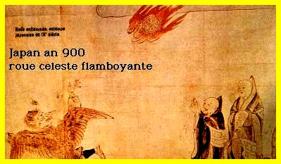 This is an illustration depicting a sighting of a burning wheel in the year 900 over Japan.