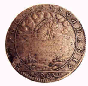 This is a French jeton minted in 1680, a coin-like educational tool that was commonly used to help people count money, or sometimes used as a money substitute for playing games. It is about the size of a U.S. quarter-dollar and similar to thousands of other jetons with different religious and educational designs that were produced and used in Europe during the 16th and 17th centuries. It appears to commemorate a UFO sighting of a wheel like object. Some researchers feel it represents the Biblical Ezekiel's wheel. The Latin inscription 'OPPORTUNUS ADEST' translates as 'It is here at an opportune time".