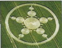 This crop circle picture features a star of five points often seen in Ancient egyptian pictures and hieroglyphs. Also there are 3 circles on each point as well as a large center circle. Could this be some sort of scientific knowledge. It seems to ve a very beautiful shape were we to see it in person we would surely be quite in awe. This also has spiral shaped wheat formations in its construction. Coincidence or is this crop circle picture the real thing. You may also notice that in many crop circles the circle is spread over 3 lines in the field, that is to say the circle usually touches upon 3 lines of intersect. Why 3 lines so often???