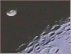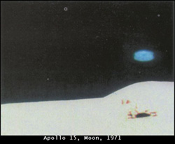 1971, Apollo 15. This photograph is from NASA, and some say we are looking at a UFO on the Moon at the time of Apollo 15 mission. Reference: NASA AS15-85/08. This bluish light mass has been explained as either debris from the capsule or some camera anomaly. Still, a very good picture, and quite a conversation piece.