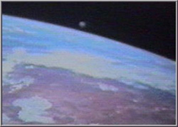Space Shuttle Atlantis, Mission STS-37 Photo Of A Sphere During the mission of the Space Shuttle Atlantis "STS-37", a metallic object arrives from the top. It swings in front of the video camera (it moves to the right and to the left, up and down). In the background we can see planet Earth.