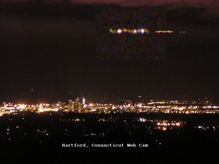 2007-Connecticut-I thought you might like to see this picture... I was watching the haze cams tonight, Blue hill, Boston, etc... I was looking at the Hartford, Connecticut, web cam and this caught my eye... it was at 10:45 pm 4/08/07. It really didn't look like a plane to me. It was out of the picture at 11:00pm. I caught quite a few different pics on those cams tonight... but, this one really caught my eye. See what you think.