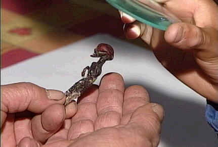 On October first of 2002, while vacationing in the Southern Chilean city of Concepcion, a group of family members found what appeared to be a small humanoid creature. The miniscule being measures about 7.2 centimeters long. It has a relatively large head, two arms with long fingers, and two legs. The discovery was first reported by "Mega News Service", which is the local news channel in the Santiago area.