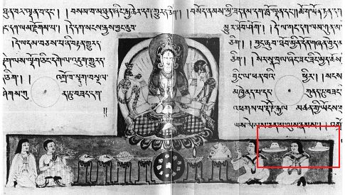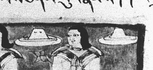 The above image comes from the 10th Century Tibetan translation of the Sanskrit text "Prajnaparamita Sutra", held at a Japanese museum. In the enlargement you can see two objects that look like hats, but why are they floating in mid air ? also one of them appears to have port holes on it. Indian Vedic texts are full of descriptions of Vimanas. The Ramayana describes Vimanas as a double decked, circular or cylindrical aircraft with portholes and a dome. It flew with "the speed of the wind" and gave forth a "melodious sound".