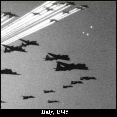 1945-Italy. This photograph was taken by a plane film crew during World War II. The source on this one is Les O.V.N. I. These planes are B-17 bombers doing their business during the height of allied bombing runs. The three white unknowns are part of the legendary "foo fighters." See full size for a great photograph of history and mystery.