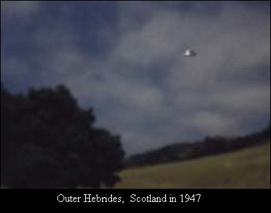 Scotland, 1947. An alleged UFO picture taken in the Outer Hebrides in Scotland in 1947. It is important to see the original picture on this one to get the full effect. This, to me, is a very good picture of an object that is not identifiable by comparision to any known aircraft today. It is obviously a metallic, two layered object which has never been explained away. A true UFO!