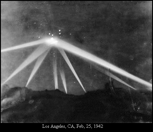 Los Angeles, February 25, 1942: 02:25pm: Alarm sirens installed in the event of a Japanese air raid are started, as flying objects are seen and announced in the sky off the city. A blackout is declared and the anxious and even terrified inhabitants follow the instructions by turning all the lights off. 03:16pm: Anti-aircraft guns open fire on the unidentified flying objects coming from the ocean, and projector beams are searching the sky. Witnesses observe small objects flying at high altitude, of red or silver plated color, moving in formation at high speed, and untouched by the AAA salvos. This large object has been touched by many AAA projectiles, according to the reports. The anti aircraft defence continues to shoot at UFOS without results.